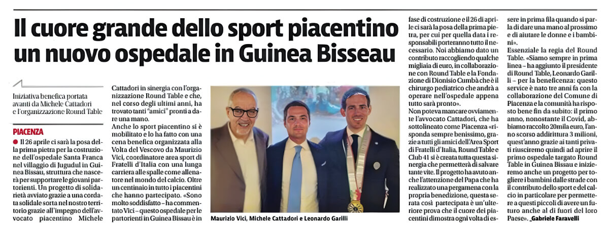 Durante una cena di beneficenza organizzata presso il ristorante La Volta del Vescovo, siamo riusciti a raccogliere la somma di 6.600€ in una sola serata. Questo evento è stato un grande successo e ha visto la partecipazione entusiasta di molti sostenitori. I fondi raccolti sono stati destinati alla costruzione dell’ospedale Round Table in Guinea Bissau, un progetto di vitale importanza per migliorare le condizioni sanitarie della popolazione locale. L’atmosfera della serata era carica di generosità e spirito di comunità, dimostrando ancora una volta quanto sia forte il desiderio di contribuire a cause umanitarie significative.
